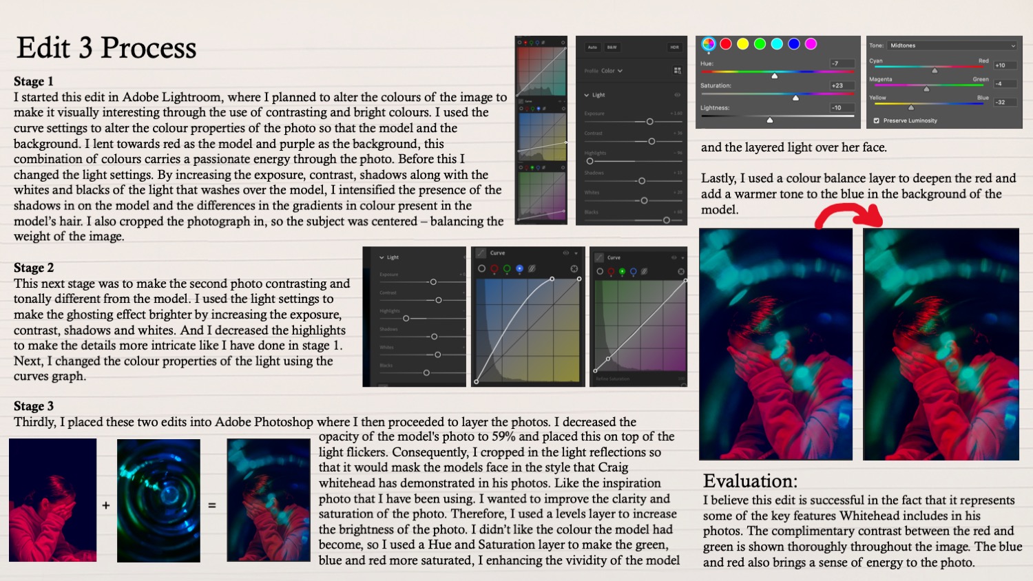 Outcome/learning From experimenting with strong contrasting (complimentary) colours, I feel that I have achieved work that reflects the style of Craig Whitehead.